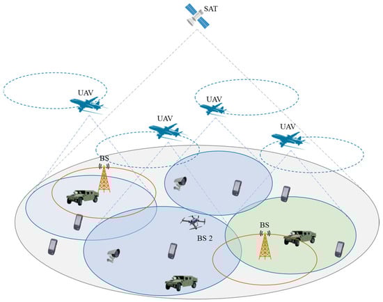 The network architecture of this study is illustrated in Figure 1. The research area is conceptualized as a circular zone, equipped with satellites, unmanned aerial vehicles (UAVs), and base stations. The satellite signals ensure comprehensive coverage across the entire area, and UAVs operate on predefined circular trajectories, while the coverage of base stations is confined. Users are outfitted with multi-mode antennas capable of accessing multiple networks, yet they are restricted to connecting to a single network node at any given instant. The user communication is structured in a time-slotted manner, segmenting the user communication timeframe into T discrete time slots, with each slot separated by a relatively minor interval. The crux of this paper’s research lies in the decision-making process for an individual user to access the space–air–ground integrated emergency communication network node during each time slot.