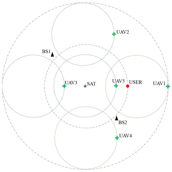 The scene schematic is shown in Figure 2. The reference coordinate system is the polar coordinate system with the center of the scene as the coordinate origin, the satellite is located at the origin of the coordinate system (0, 0), the coordinates of the flight centers of the UAVs are set to be , the flight altitudes are set to be , respectively, the initial positions are all set to be on the positive half-axis of the x-axis with the respective flight centers as the origin, and the positions of the base stations are set to be , respectively. The coordinates of the user’s motion center are (0, 0) and the initial position is set to (200, 0). The total time slot of the simulation is set to be 1000, and in order to overcome the randomness of the network environment, each group of experiments is repeated 100 times.