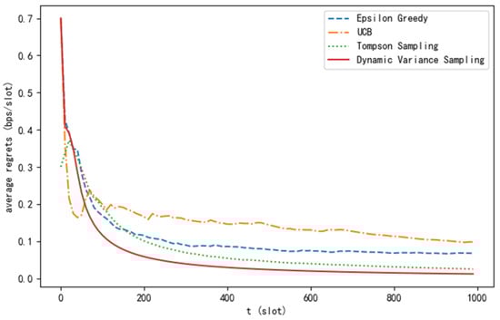 From Figure 4, it can be observed that as the number of time slots increases, all four algorithms are capable of gradually reducing the average regret value towards stability. However, the dynamic variance sampling algorithm proposed in this paper has a faster convergence rate compared to the other three algorithms, and the average regret value approaches closer to 0.