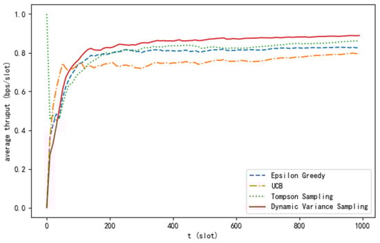 Figure 6 illustrates the mean throughput of the four algorithms following 1000 iterations. Analysis of the figure reveals that, within the simulated environment described, the mean throughput of the algorithm introduced in this study has experienced enhancements of 7.63%, 11.96%, and 3.13% relative to the ε-greedy algorithm, Upper Confidence Bound (UCB) algorithm, and Thompson sampling algorithm, respectively.