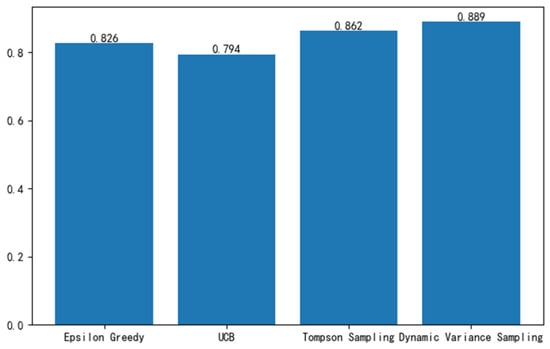 The experiment compares the dynamic variance sampling algorithm proposed in this paper with current mainstream algorithms (ε-greedy [18], UCB, and Thompson sampling, etc.) from different perspectives, ultimately verifying the superiority of this algorithm. As can be seen from Figure 3, the cumulative regret value of the algorithm proposed in this paper grows in an approximately logarithmic relationship with the time slot and ultimately converges, which confirms the deduction of Theorem 1.