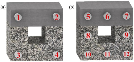 Twelve AE sensors are employed. The sensor grid is arranged in a rectangular pattern on the typical surface position of the combination, forming a sensor monitoring network. Due to the need for DIC monitoring on the front, four sensors are placed on the front, while eight sensors are positioned on the back, as illustrated in Figure 4.