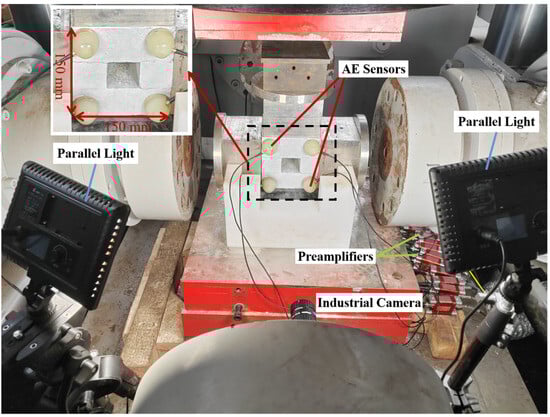The test employs a ME2P-1230-23U3M industrial camera (Daheng Imaging Technology Co., Ltd., Beijing, China) for speckle imaging, with an image size of 4096 × 3000 pixels and a frame rate of 5 frames/s. Throughout the test, the specimen surface’s monitoring area is illuminated to guarantee clear speckle photo capture by the camera. The AE system and DIC system are shown in Figure 5. Before the experiment began, measures were taken to adjust the position and angle of the fill light, as well as the focus and position of the camera, to ensure that the photos taken in the software were of high quality. In the subsequent processing of speckle photos, high-quality speckle images were also selected for analysis.