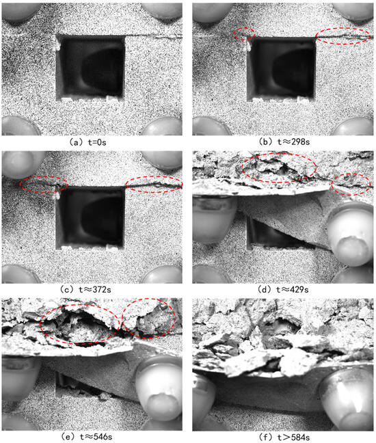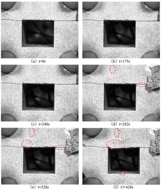 The speckle photos clearly depict the damage evolution of the specimen at various loading times. Dislocation starts to manifest at the interface around 298 s of loading. At approximately 372 s of loading, noticeable deformation emerges at the combination interface. Concurrently, the filler material above the void area gradually stretches due to the applied force. Around 429 s of loading, numerous cracks become observable within the backfill material. With continued loading, the backfill progressively loses stability and eventually fails in a spalling manner above the void area, as illustrated in Figure 6.
