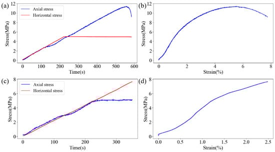 Stress–time and strain–stress curves under different loading conditions: axial loading: (a) stress–time, (b) stress–strain; horizontal loading: (c) stress–time, (d) stress–strain.