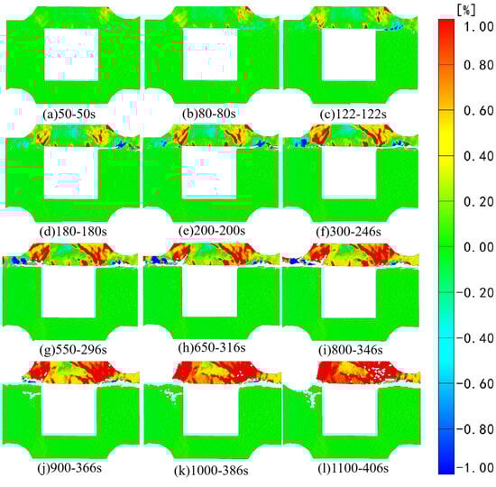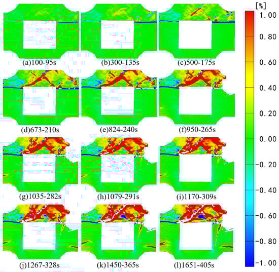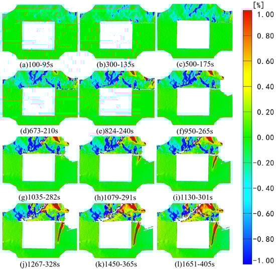 Figure 11 depicts the strain field analysis in the Z direction, aligning with the Z direction of the specimen coordinate system, throughout the test loading process.