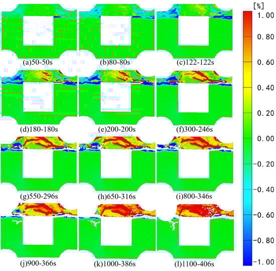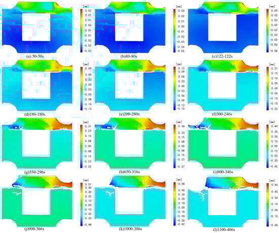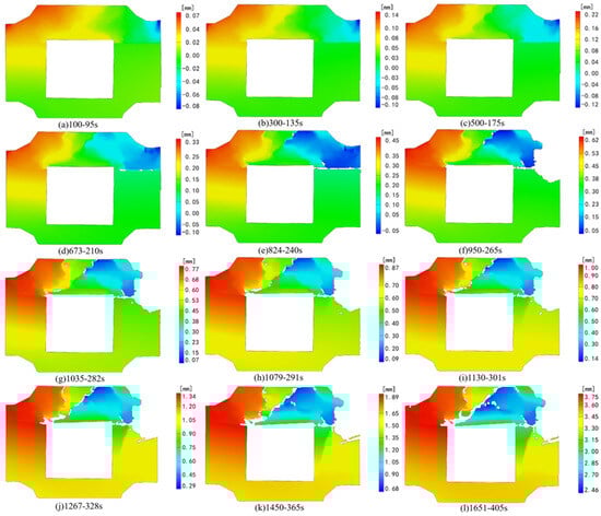 Following the time node of strain field change in the X direction, we chose the corresponding time node of deformation field changes (Figure 10) for analysis. At 50 s of loading, deformation emerges at the right interface of the combination near the cavity’s end, aligning with the results of strain field analysis. After 180 s of testing, noticeable deformation areas appear in opposite directions at the left and right ends of the backfill body. The discrepancy in deformation under the combination’s right-side interface indicates an interface dislocation phenomenon. At 296 s into the test, horizontal loading ceased, and the composite specimen primarily endured axial stress, yet prominent deformation remained concentrated at the composite backfill’s left and right ends. Throughout the subsequent loading process, the deformation zone progressively extended from both ends of the combination backfill towards the center, signifying the emergence of a tensile stress area above the void region, consistent with the strain field findings along the X direction.