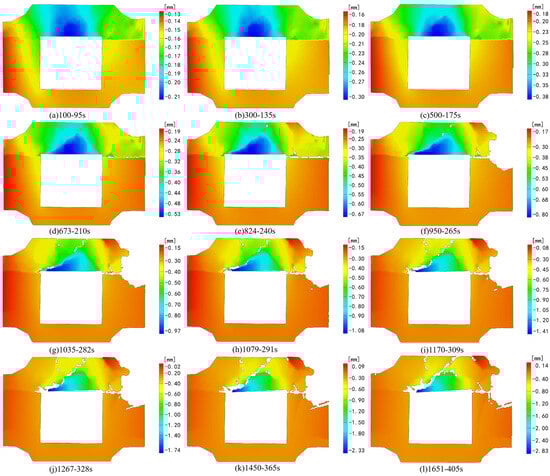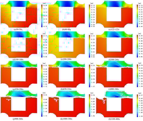 In contrast to the Z-direction strain field, the deformation field of granite in the Z direction undergoes gentle changes. The deformation of the backfill part is noticeable throughout the entire process, while the deformation field of the granite part experiences some changes under initial stress, albeit minor overall. Figure 16 shows that the filling body above the void area exhibits the highest degree of freedom during the initial loading stage, displaying a relatively pronounced downward trend. By 210 s of loading, the negative displacement area of the backfill body above the void gradually diminishes downward, forming a triangular area as observed in the strain field. Concurrently, the displacement change of the granite part becomes gradually stable. With ongoing loading, cracks in part of the backfill body continue expanding, accompanied by evident deformation fields on both sides of the cracks. The degree of deformation gradually diminishes from the left endpoint above the void to the upper right along the trend of crack expansion, aligning with the changing trend post-failure of this part of the backfill body.