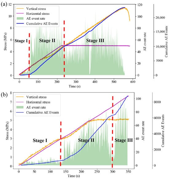 Indeed, DIC analysis exclusively reveals alterations on the monitored surface. To further explore the evolution process of internal specimen damage, AE events are monitored during the loading process. The loading process under different loading conditions is divided into three stages based on the variation trend of accumulated AE events (Figure 17).
