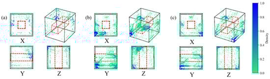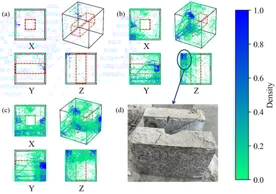 During horizontal loading failure, acoustic emission events are initially concentrated on the top backfill and granite on both sides of the void during the initial compaction stage (Figure 19). Later, a few abnormal strain concentration areas appear in the top backfill. In the second stage, there is a rapid increase in cumulative AE events, mainly distributed in the left granite area. The AE events in the top pack transition from uniform distribution to being concentrated in the area above the void, and there is significant AE event accumulation on the rear side of the entire combination. Notably, significant abnormal strain concentration appears at the left granite edge in the late stage, which is consistent with the clustering area of acoustic emission events. In the third stage, AE events are more concentrated above the void in the X direction and evenly distributed in the Y direction. This indicates that the damage to the backfill body had evolved in most areas at this time. Moreover, the high-density AE event area in the granite part shifted from the left side to the right side, which is consistent with the abnormal strain concentration area presented by the granite on the right side.
