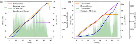 Variation of AE event rate and cumulative event number under different loading conditions: (a) axial loading; (b) horizontal loading.