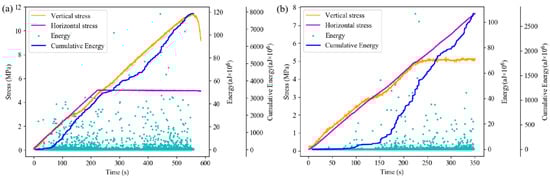 The energy variation during axial loading failure differs significantly from that during horizontal loading failure. Under axial loading failure conditions, the accumulated AE energy exhibits a step-like change. Initially, due to fewer AE events, the accumulated AE energy remains low, then increases rapidly with the increase in AE event rate. After the horizontal stress reaches the preset value, the rate of increase in AE cumulative energy decreases slightly, then increases with the increase in AE event rate and the occurrence of high-energy events until the axial stress reaches its maximum value. Notably, in this process, large energy events are mainly concentrated after the horizontal stress reaches the preset value.