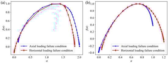 First, the AE signal energy and rise time of the entire loading process were analyzed under various stress conditions using multifractal analysis. The resulting multifractal spectrum parameters are presented in Table 2, and the corresponding multifractal spectrum is shown in Figure 22. The multifractal spectral curves obtained exhibit uniform left-skewed distribution patterns. The associated with AE energy during axial loading failure demonstrates a negative value close to 0, suggesting a relatively balanced occurrence of large energy events and small energy events. Conversely, the corresponding to AE rise time notably exceeds 0, indicative of a damage evolution process predominantly characterized by shear failure. Conversely, during horizontal loading failure, large energy events occupy a comparatively higher proportion.