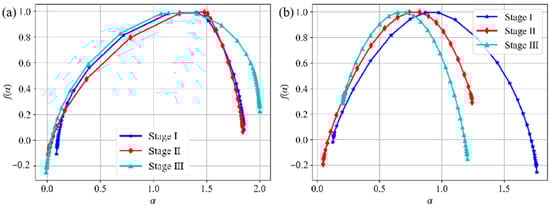 Multifractal spectrum of AE energy and rise time at different loading stages: (a) AE energy; (b) AE rise time.