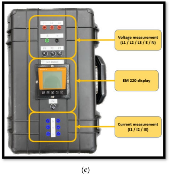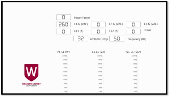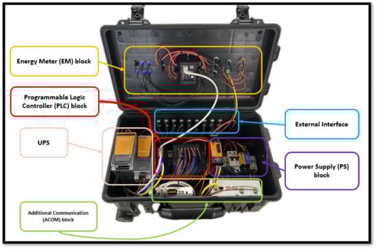 The hardware used and the layout applied to the case enables the system to operate continuously in any environment with ambient temperatures varying from −10 °C to 45 °C. Using a PLC and an energy meter (EM) means that the system acquires voltage and current, and its fundamental characteristics, such as frequency, harmonic distortion, power factor, and load characteristics.