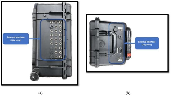 (a) The side view of the external interface of the portable IoT station; (b) the top view of the external interface of the portable IoT station; (c) the front view of the external interface of the portable IoT station.