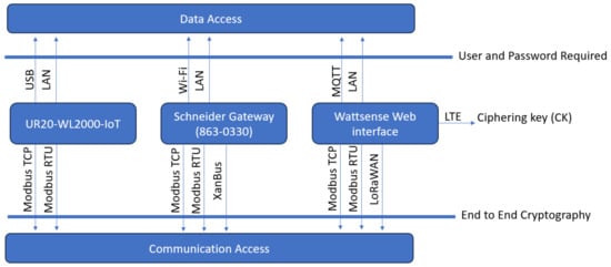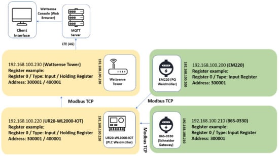 The gateway used to establish XanBus communication uses Modbus TCP to communicate with the rest of the portable IoT station network. The system layout allows any gateway to interact with the portable IoT station if a Modbus port is available in the gateway. To complement the network interface of the portable IoT station, a low-power, wide-area networking protocol built on LoRa radio communication (LoRaWAN) gateway developed by Wattsense was incorporated into the system, converting the data from the LoRaWAN band to Modbus TCP.
