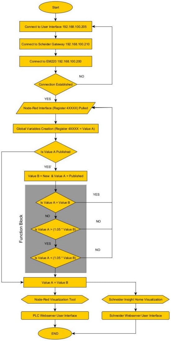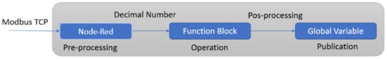 To examine the refresh rate, a set value of registers was pulled from the Node-RED interface, acquiring the desired register from the Modbus TCP network. The debug function on Node-Red served to define the “start point”. To provide an accurate performance indication of the communication system, each test was repeated three times. To remove any additional variable, once a test scenario was acquired, a power cycle process would commence, resetting any existing buffer and cache memory that might impact the final results. The value displayed under the data latency evaluation is an average result of each repeated test.