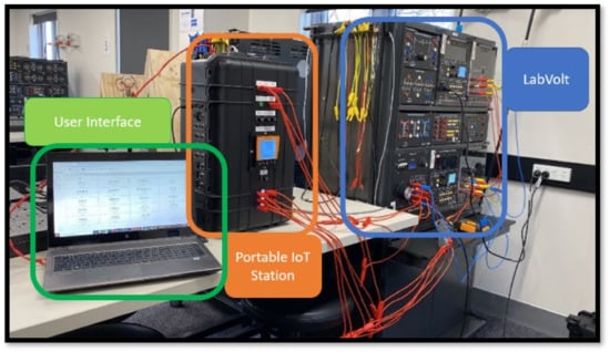 As mentioned previously, most of the hardware utilized in the portable IoT station is commercially available. However, the construction of the portable IoT station required adaptations to convert a stationary din rail-mounted system into a portable interface. For that, structural changes had to be made on the casing to install a din rail where the components could be mounted, while a cable management structure was implemented following local wiring standards, such as AS/NZS 3000:2018 [21].