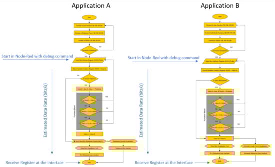 The refresh rate was defined as a period between the debug command on Node-RED, and the updated value at the targeted interface. Both applications meet the expected performance requirements. Application B achieved a much higher data rate than Application A, as shown in Figure 18. However, it is noted that the data rate from Application A is sufficient for most IoT applications.