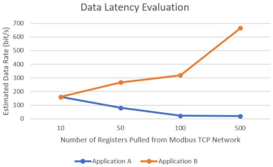 The following Table 6 and Table 7 shows the performance acquired from Application A and Application B. All results are summarized into a single graph, which outlines the estimated data rate measured in bits per second and display against the number of registers pulled from the Modbus TCP network.