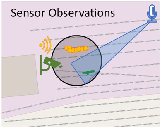 Table 1 provides an overview of all the recorded sensor observations. A sensor observation comprises the location (i.e., geo-location) of the detected object, a timestamp, the confidence level and a label. The labels assigned by the video detector consist solely of “person”, indicating that the person detector was based on thermal images. The labels assigned by the acoustic sensors were as follows: speech, rattle and vandalism (e.g., glass breakage). No classification was performed by the radar detector. Consequently, the labels were designated as unknown. It should be noted that the primary objective of the radar detector was to detect movement. Therefore, the sensor observations were utilised as complementary observations for individuals in motion. These data represent the requisite input for the fusion model.
