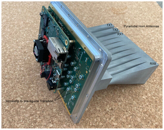 Figure 3. The chosen RF buildup supports novel 3D-printed antenna arrays, and therefore, the radiation characteristics can be selected to match the desired field-of-view (FoV). An array with pyramidal horn antennas was used to conduct the measurements.