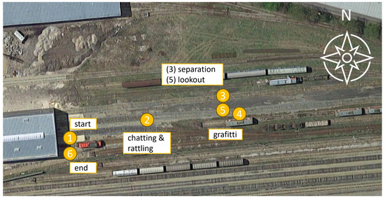 Figure 5 shows the progression of the scenario—group committing graffiti.Two people (a lookout and a sprayer) start with the intention of committing vandalism, in the form of graffiti on a train, starting from (1). Both carry spray cans and start walking silently towards (2). When they are about halfway to the target train (4), they start chatting silently and prepare the spray can by shaking it and making rattling noises at position (2). Continuing to chat and rattle, they move towards the train until they reach position (3). At this point, one person moves to start the graffiti at position (4). At the same time, the second person moves to position (5) to act as a lookout for possible disturbances. After some time, the lookout is told by a fictitious security guard to report any interference. As a result, both people try to escape towards position (6), completing the scenario. This scenario takes approximately 2 min.