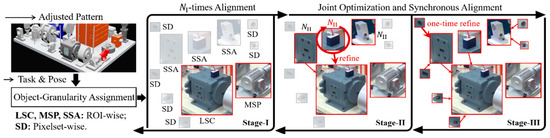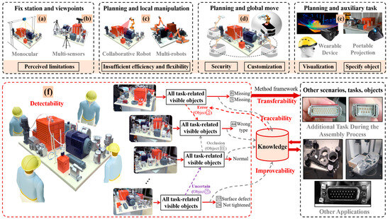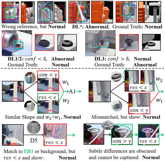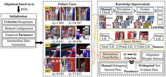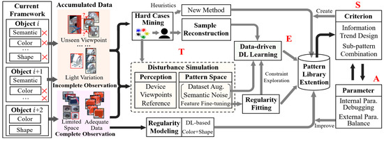- Incomplete observation. Essentially, incomplete observation is a challenge that less constrained vision-based applications will inevitably face. In other words, any changes in Man–Machine–Material–Method–Environment (4M1E) may lead to deviations in perception that are difficult to be covered by the pattern space constructed by existing knowledge such as an unseen viewpoint. In this situation, if the difference with the internal sub-pattern space is too large, then manual intervention is necessary. For the semantic space, difficult case mining and augmentation [57,59] has been proven to be an effective strategy. For other spaces, exploring new sub-patterns or reconstructing existing patterns can be considered;