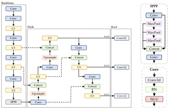 The YOLOv5 architecture is composed of three parts: CSP-Darknet53 as the backbone, Spatial Pyramid Pooling Fusion (SPPF) and CSP-PAN (Path Aggregation Network) structures in the neck [34], and the same head as YOLOv3. CSP-Darknet53 is formed by applying a Cross Stage Partial Network (CSPNet) to Darknet-53. The amount of computation may be significantly decreased with CSPNet, and both the inference speed and accuracy can be improved [35]. In the neck, the SPPF is a faster variation of a Spatial Pyramid Pooling (SPP) block. Figure 1 shows the architecture diagram of YOLOv5s.
