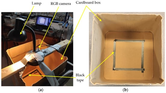 Firstly, a scenario was built consisting of a cardboard box, a lamp, a camera, and some black tape (Figure 2).