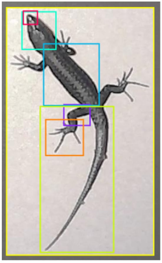 The image labelling was carried out using Roboflow. For each image, bounding boxes were drawn around each part of the lizard’s body to be identified and labelled with the respective class. In total, seven classes were identified: “Lizard” (yellow bounding box in Figure 3), “Snout” (red bounding box in Figure 3), “Head” (cyan bounding box in Figure 3), “Dorsum” (blue bounding box in Figure 3), “Tail” (green bounding box in Figure 3), “Leg_L” (purple bounding box on the left hind leg in Figure 3), and “Palm_L” (orange bounding box on the left hind palm in Figure 3).