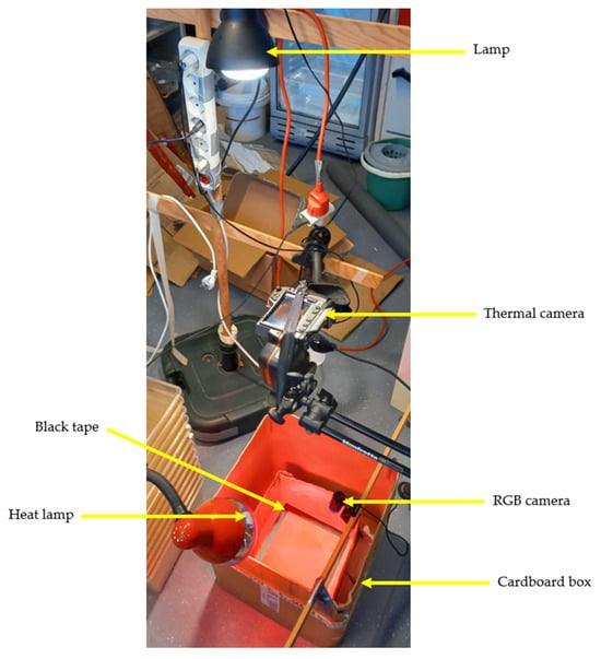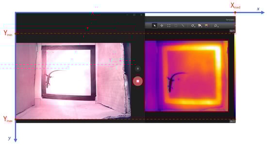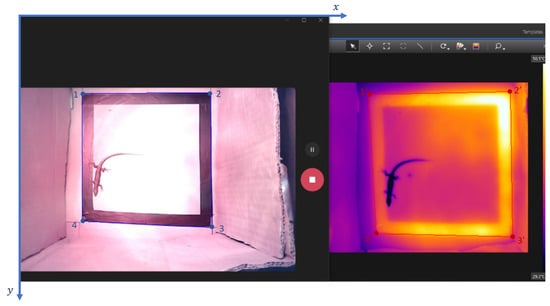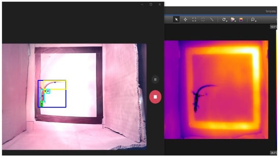 The lizard was placed inside the cardboard box, and both cameras simultaneously filmed the animal’s behaviour for a few minutes. The RGB camera and the thermal camera were placed side-by-side, as presented in Figure 5, and the videos were saved in the same way (screen recording). Some videos were recorded with the heat lamp on and others with the heat lamp off to observe more significant changes between videos in the animal’s colour in the thermal images (change in the animal’s body temperature). Using the RGB camera helps to determine the position of the lizard in the thermal camera, especially if the lizard is at the same temperature as the background.