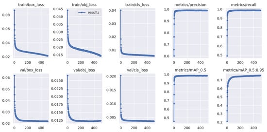 Figure 16 displays all the graphs of the average values obtained after training. Each graph represents the change in a certain value (y-axis) as the number of epochs increases during training (x-axis). As mentioned previously, the number of epochs used in training was 500, so the x-axis will go up to the value of 500. The four graphs on the right side of Figure 16 correspond to the previously mentioned metrics: precision (“metrics/precision”), recall (“metrics/recall”), mAP_0.5 (“metrics/mAP_0.5”), and mAP_0.5:0.95 (“metrics/mAP_0.5:0.95”).