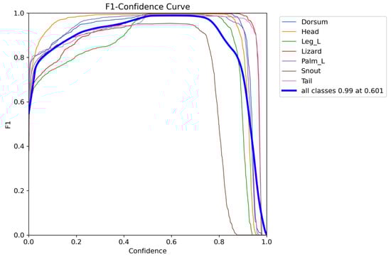 The F1 score curve illustrates the F1 score across different thresholds, offering insights into the model’s balance between false positives and false negatives. Figure 17 shows that the maximum F1 value is 0.99 when the confidence score is 0.601.