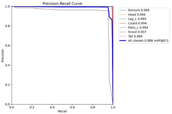 Figure 18 presents the precision–recall curve, where a larger area under the curve indicates better overall performance. The “Snout” class has a smaller area under the PR curve, indicating that the model has more difficulty in correctly detecting this class compared to the others. (mAP_0.5 of 0.937).