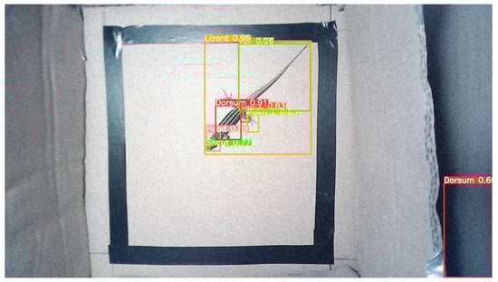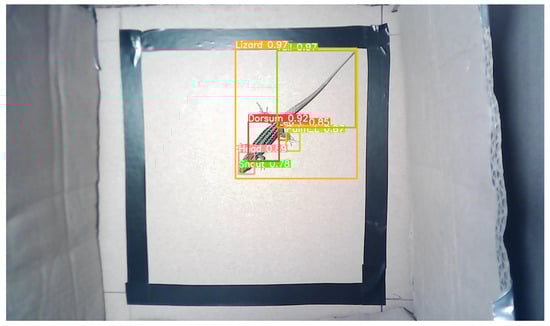 Noise was added to Figure 19, as demonstrated in Figure 20, to analyse the model’s performance on noisy images and variations in image quality. As shown in Figure 20, the model was able to correctly detect the lizard and its six body parts with confidence scores ranging from 77% to 96%. However, one more bounding box corresponding to the “Dorsum” class was incorrectly detected, with a confidence score of 60%.