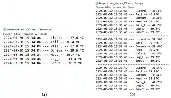 Applying the methodologies presented in Section 2.2, it was possible to successfully obtain the final temperature values in different images and videos. Figure 21 shows an example of the temperature values obtained for the lizard and its body parts in an image and a video.