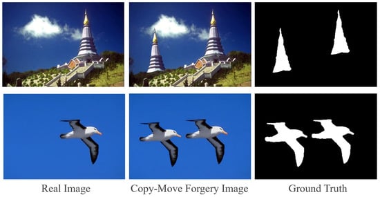 Datasets: We conducted experiments on three public datasets for CMFD tasks that contain various copy–move-tampered images and corresponding ground truths that annotated the regions that have been tampered with. The regions related to copy–move forgery are marked in white, whereas the regions unrelated to copy–move forgery are marked in black. All datasets were split into training, validation, and testing sets in approximately an 8:1:1 ratio. The basic information of the three datasets is shown in Table 1.
