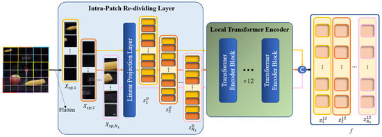 In the local branch, we still need to divide into several patches, called global patches, and then flatten these patches to a 1D sequence . Note that in this branch, every global patch will be treated as an input image, i.e., during image pre-processing, every global patch will be re-divided, and each global patch will be divided into several sub-patches with a resolution of , called local patches. Afterwards, each batch of local patches is sent to the linear projection layer to be processed as a local patch embedding and then added to the position embedding as the input of the local Transformer encoder . In this case, ; m represents the m-th global patch; ; represents the -th local patch that belongs to the m-th global patch. Thus, pre-processing by the local branch is finished. The following procedure for obtaining the local patches is performed in the Intra-Patch Re-Dividing Layer (IPRL), and it can be formulated as