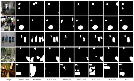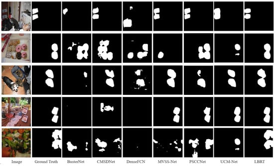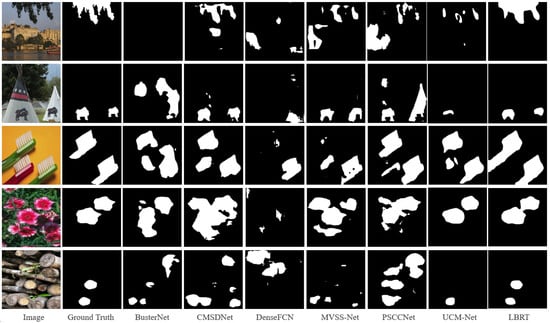 The result shows that LBRT significantly outperforms all other baselines in all metrics on this dataset. The F1-score of LBRT is nearly 11.40% higher than the second-ranked UCM-Net. This demonstrates that, even with different data distributions, as long as there is a sufficient amount of data for fine-tuning, LBRT can learn more comprehensive information related to copy–move forgery and achieve better prediction results. It can be observed in Figure 9 that LBRT can learn the similarities between regions that have been tampered with from a global perspective and the differences between the regions that have been tampered with from a local perspective in various copy–move forgery scenarios. By integrating these two features, LBRT can identify more correct regions that have been tampered with and achieve more accurate localization.