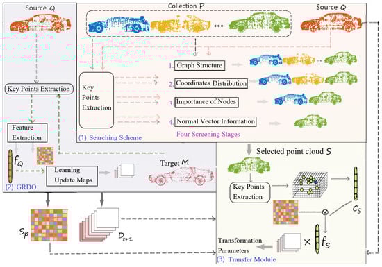 The framework of SGRTmreg includes three steps: (1) a searching scheme for selecting a similar point cloud from a collection for the source model by comparing the similarity of and in four screen stages; (2) considering graph structure, coordinate distribution, and the importance of nodes and normal vector information, a learning-based optimization method called GRDO for learning a single sequence of regressors via the alignment of the source model and the target model ; (3) a transfer module for estimating the transformation between by transferring the learned regressors to the selected model . To reduce storage requirements and computation costs, each step works on the extracted key points.