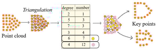 To reduce the storage requirement for designing features and learning regressors while cutting computational costs for GRDO, we design a key point extraction approach for downsampling point clouds. Figure 2 shows the process of key point extraction. Given a point cloud, Delaunay triangulation is applied to the top view (xy-view) of the point cloud to form a graph [44], where nodes represent vertices and edges represent connections between nodes. Then, the degrees of all nodes in the graph are counted. The degree of a node is the number of connections that it has to other nodes in the graph. Nodes with higher degrees have more connections, signifying their greater importance. Nodes connected by the non-shared edge between two triangles will be extracted as boundary points. The nodes whose degree has the most or the second most occurrence number and boundary points are selected as key points. Figure 3 shows that the proposed key point extraction approach reduces points while preserving detailed model information in contrast to the random and uniform downsample methods [24].