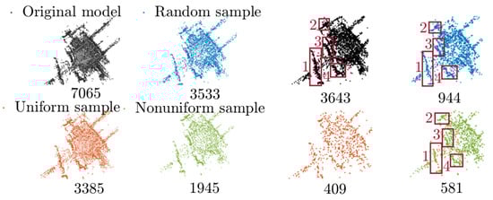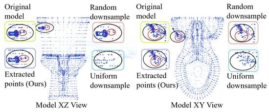 The comparison of our key point extraction approach with the random and uniform downsample methods. This figure shows the zoomed-in model from the XZ and XY perspectives. The dark circles show the difference. The red circles show the main detailed difference.