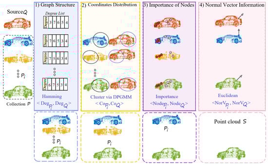The searching scheme aims to identify the most similar point cloud from the set by comparing the similarity between each point cloud and the target through four screening stages: (1) Measure the graph structure similarity between point cloud pairs by employing the Hamming distance on their degree lists . (2) Measure the similarity of coordinate distribution by clustering the mix of key points in via the Dirichlet Process Gaussian Mixture Model (DPGMM) [45]. (3) Measure the similarity in the importance of graph nodes using the Eigenvector centrality method [46]. (4) Measure the similarity in normal vectors in Euclidean space. The point cloud passing these four screening stages will be chosen as the similar point cloud , as shown in Figure 4.