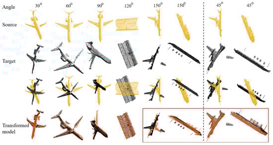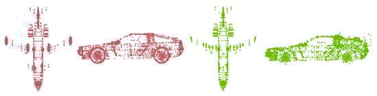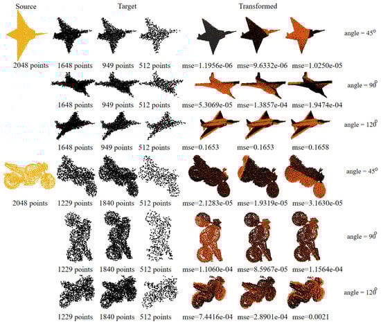 The parameters in the training process are similar to those in DO [42]. Given the source model and the target model , we first normalized them to lie in [−1,1]. Then, we applied the following perturbations to the source model to generate the training samples: (i) Rotation and Translation: The rotation is within 45° and the translations is in , which represents the ground truth ( in (12)). (ii) Noise and Outliers: Gaussian noise with the standard deviation 0.05 is added to ; 0 to 300 points within are added as the sparse outliers. A Gaussian ball of 0 to 200 points with a standard deviation of 0.1 to 0.25 simulates the structured outliers. (iii) Occlusion: We remove 40% to 90% points from to simulate occlusions [42]. We generate 30,000 training samples, and set as , (N = 30,000, = in Equation (12)). Please note that the rotation range in the above settings covers the relative position of the target model and the source model .