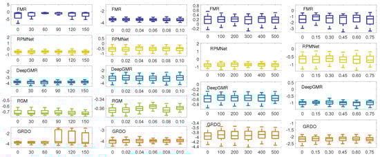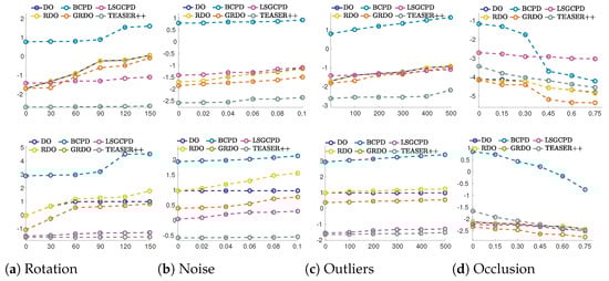 For DO and RDO, we set as 0.03. The value of the tolerance of the absolute difference between the current estimation and ground truth in iterations is . For BCPD, the expected percentage of outliers is 0.1, the parameter in the Gaussian kernel is 2.0, and the expected length of the displacement vector is 400. For LSGCPD, the expected percentage of outliers is 0.1, and the maximum iteration is 30. For TEASER++, Graduated Non-Convexity (GNC) [50] is used to estimate rotation, and the factor for increasing/decreasing the GNC function control parameter is set to 1.4. All deep learning networks are trained on a Nvidia Geforce 2080Ti GPU with 12 G memory. The parameter settings for FMR, RGM, DeepGMR, and RPMNet are shown in Table 1.