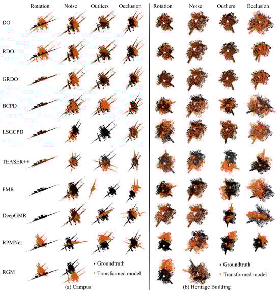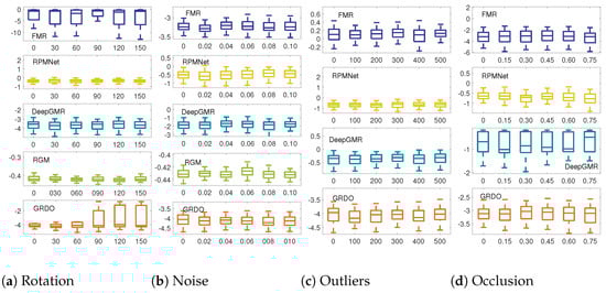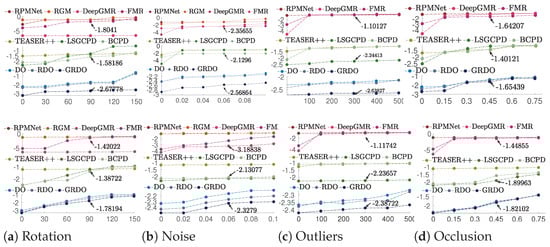 We conduct registration experiments on the MVP dataset [36] under various rotations to evaluate the performance of GRDO on partial point cloud registration. The MVP dataset is a large-scale multi-view partial point cloud dataset comprising over 100,000 high-quality scans, and it provides a training set with 62,400 partial–complete point cloud pairs and a test set with 41,800 pairs. We randomly select six pairs for registration. Notably, GRDO is solely trained on complete models, employing the following training parameters: rotation—90°, noise—0, outliers—0, and missing ratio— to . In the test stage, we use the learned regressors to register the partial point cloud pairs directly. Figure 20 shows that GRDO can register partial point cloud pairs and perform well under varying occlusions yet struggles with larger rotations.