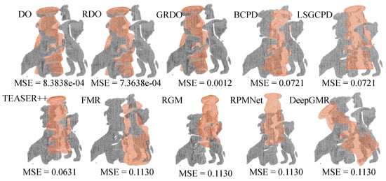 Mean Square Error (MSE) evaluates the performance of registration methods, which measures the average squared difference between the coordinates of the registered point cloud and the target point cloud. Since DO, RDO, BCPD, LSGCPD, GRDO, and TEASER++ are all implemented in MATLAB 2022b, the computation time in seconds serves as an additional metric for assessing these registration methods.
