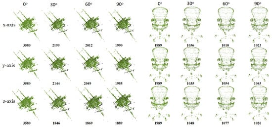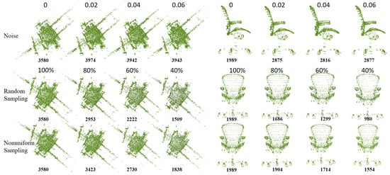 Given that GRDO extracts key points based on graph structures, we suspect its sensitivity to matching point clouds with varying densities, especially when the source and target point clouds are from different or noisy density distributions. We conduct registration experiments on the MVP dataset with varying densities to investigate this. We first rotate the original model by 45°, 90°, and 120° to obtain the ground truth, then add Gaussian noise with a standard deviation of 0.02 to the ground truth, which is downsampled via the random sample, uniform sample, and nonuniform sample methods to create target models. The training parameters are rotation—150°, noise—, outliers—0, and missing ratio—0. The registration results are shown in Figure 21. As the number of points increased, the registration accuracy improved significantly. Surprisingly, even with a threefold difference in the number of points between point clouds (2048 vs. 512), GRDO successfully registered them, proving its resilience to density distribution variations while maintaining high accuracy.